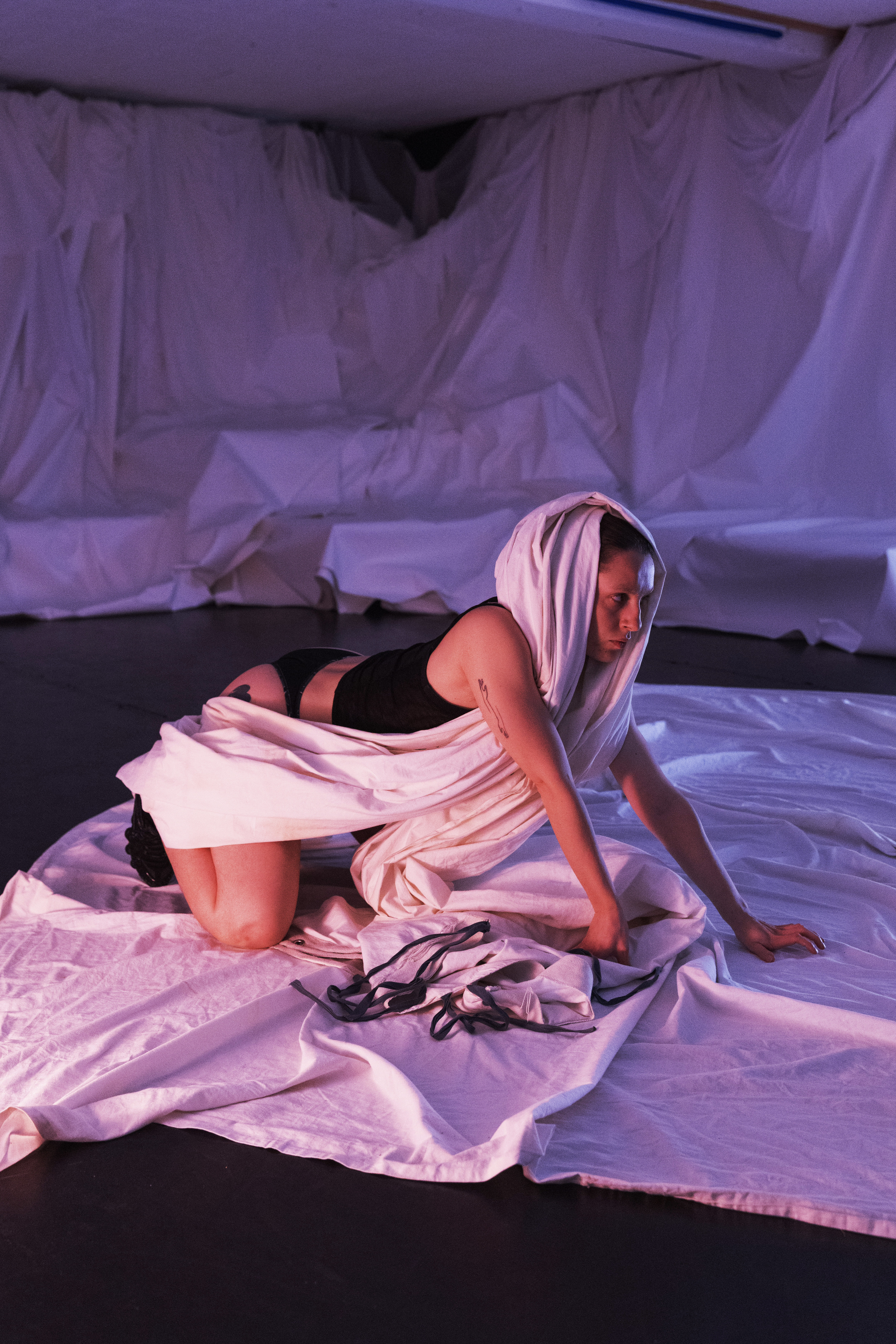La performance how do I exhibe un moi performatif cherchant des réponses face à l’expérience d’un moi social, souvent dans l’incapacité de se concevoir autrement que comme une surface sur laquelle les hommes cishet peuvent projeter leurs désirs. Il est aussi question de dépassement de l’(auto-)objectification dans le processus chorégraphique, me permettant de tendre vers une hyper- sexualisation assumée la poussant jusqu’à sa propre absurdité. La pièce a aussi une volonté de digestion de sensations physiques qui n’effacent cependant pas de traumas passés mais revendiquent un corps, outil principal de ma pratique, dans lequel je peux dorénavant me reconnaître.